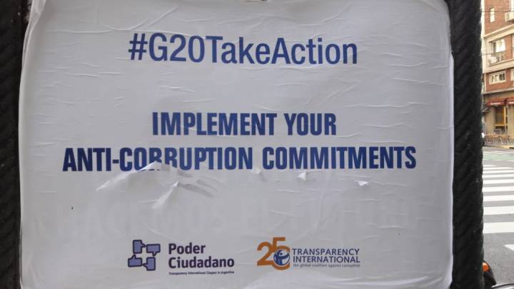 A su llegada a una Buenos Aires blindada y con despliegues de seguridad nunca antes vistos, los mandatarios mundiales se toparon con la campaña “#G20TakeAction: Implemente sus compromisos anticorrupción” realizada por Poder Ciudadano y Transparencia Internacional en su reclamo porque los países del G20 lleven a la acción compromisos asumidos de lucha contra la corrupción durante cumbres pasadas. La campaña empapeló las principales avenidas de la ciudad por donde pasaron las comitivas presidenciales en su camino a la sede del G20. La campaña exigió el cumplimiento efectivo del plan de acción anticorrupción formulado en cumbres pasadas, pero apenas parcialmente implementado. Solicitaron que no se firmen nuevos documentos sin antes cumplir compromisos pendientes, como por ejemplo, la publicación de las declaraciones juradas de funcionarios públicos, mayor transparencia en los procesos de compras y contrataciones públicas y la identificación precisa de los verdaderos propietarios de empresas contratadas por el Estado. El monitoreo de las OSC documentó que la mayoría de los países del G20 no han cumplido compromisos pasados y continúan haciendo la vista gorda al avance de la corrupción en el mundo.