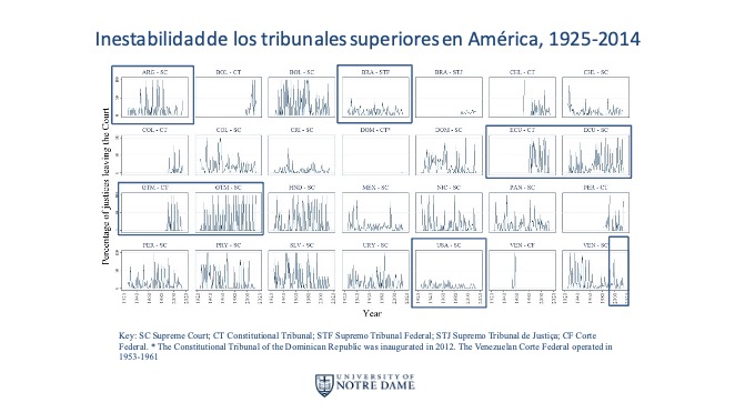 This graph is the result of research we have been conducting jointly with Andrea Castagnola from Argentina. It shows, simply, the percentage of judges who left each Supreme Court or Constitutional Court in Latin America between 1925 and 2014.